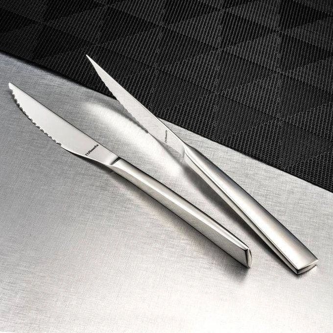 L’élégante poignée rivetée en acier inoxydable (finition miroir) offre une excellente prise en main.